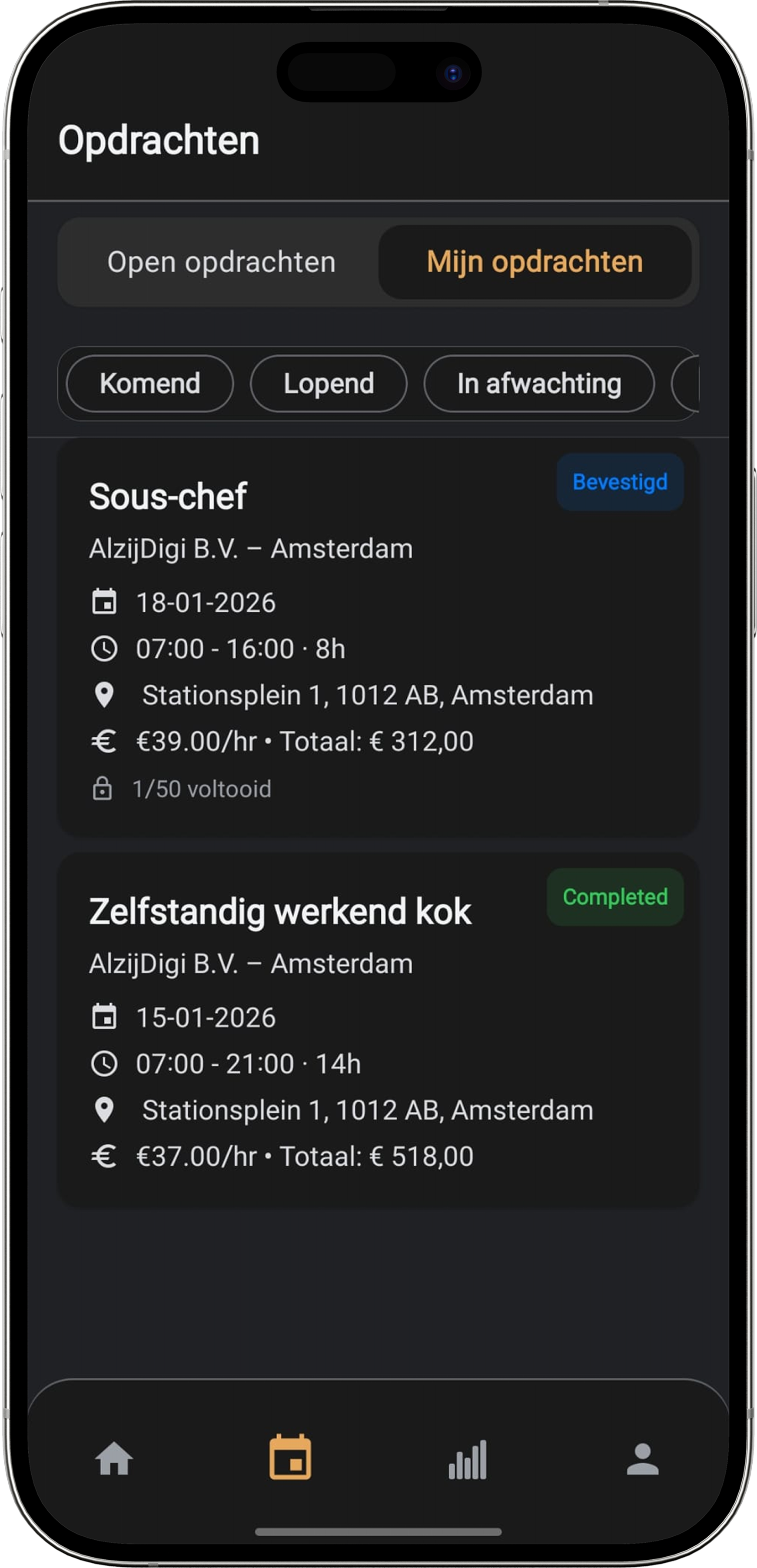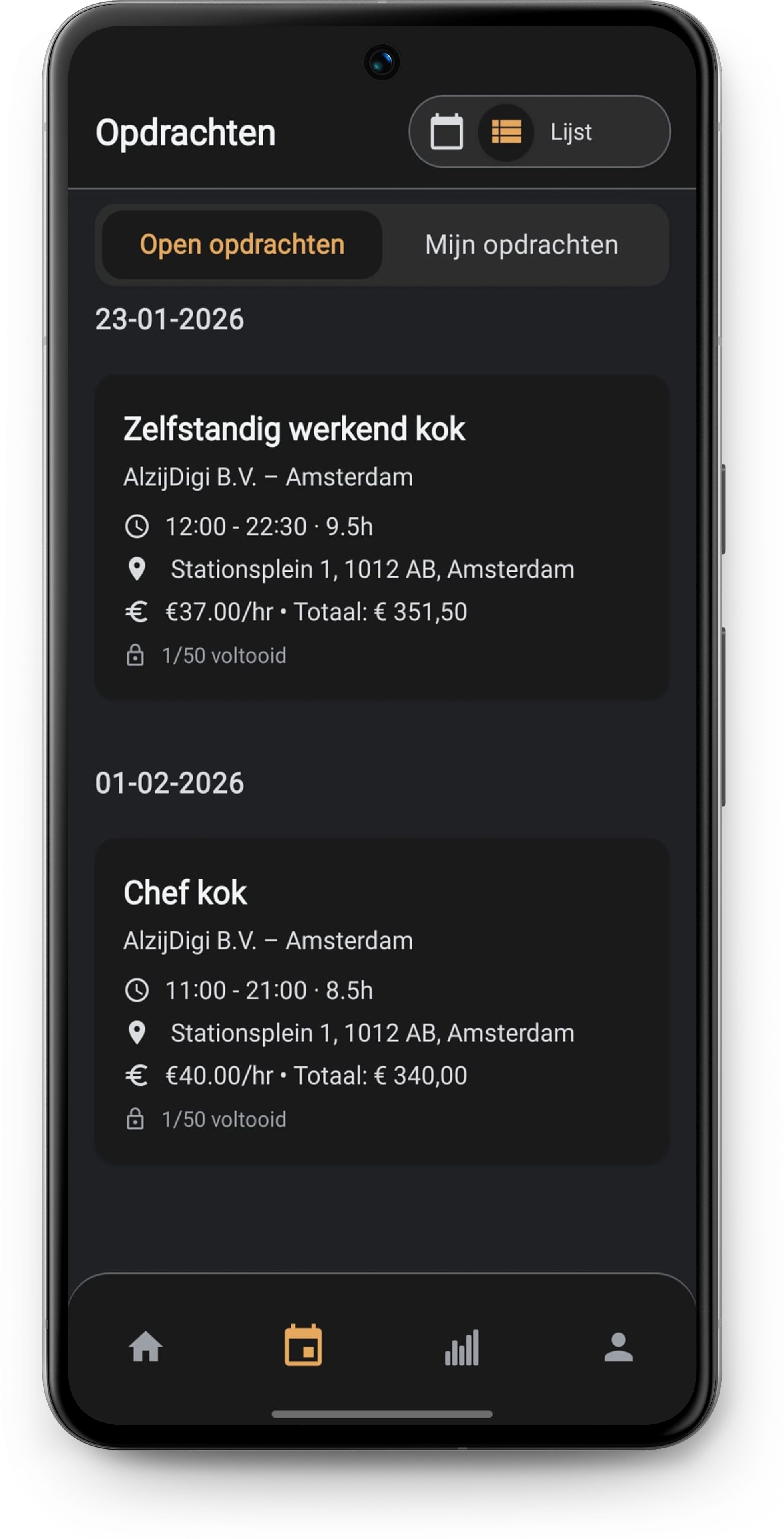Beheer je opdrachten via onze mobiele app. Meld je aan voor opdrachten, check in en registreer je uren in een overzicht.